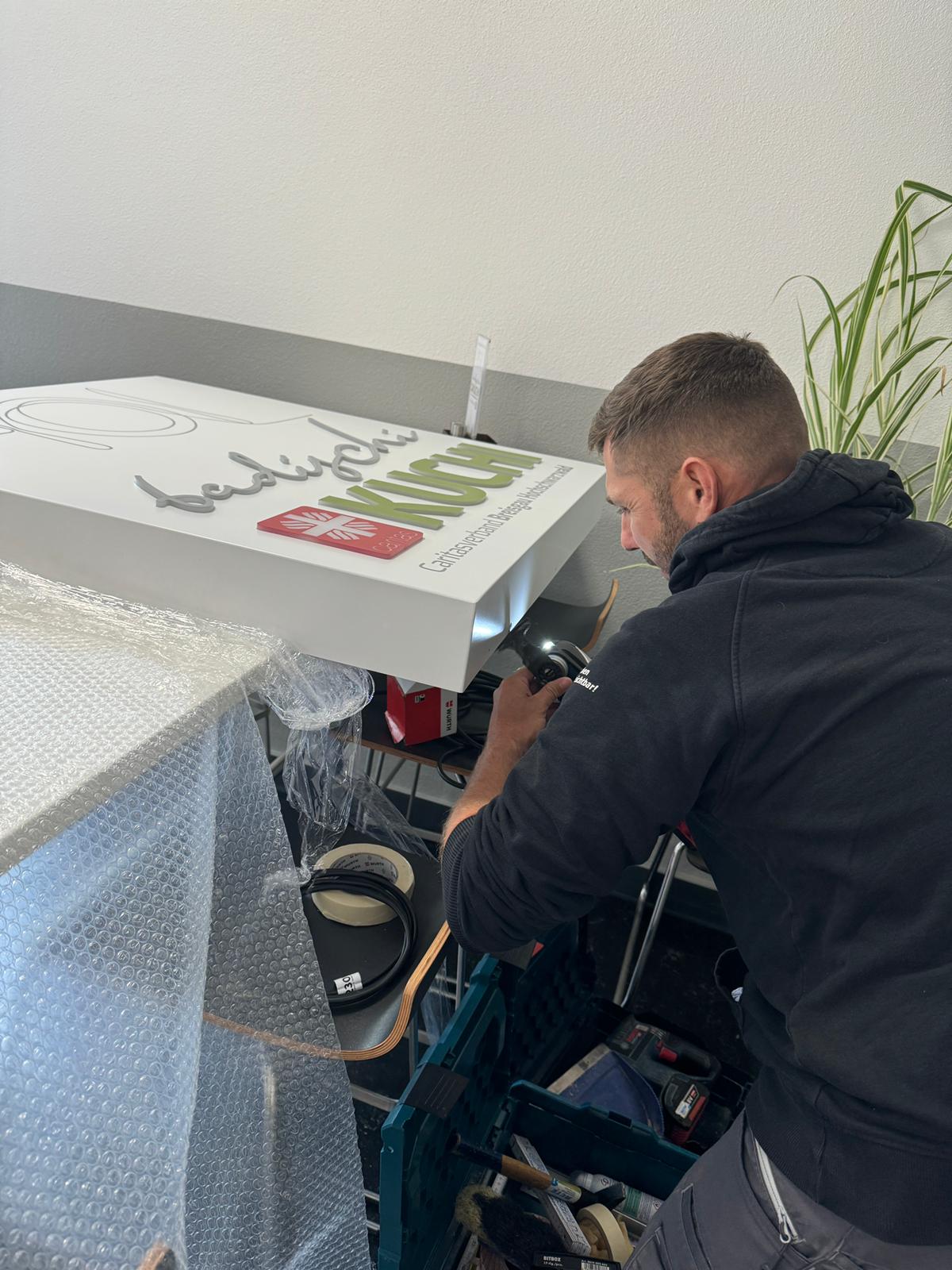 Klare Linien und eine durchdachte Darstellung ermöglichen eine schnelle Kommunikation mit unseren Gästen: Die Menüs sind gleich am Eingang sichtbar, und auf jedem Tisch stehen praktische Tischaufsteller, die gleichzeitig Salz und Pfeffer beherbergen. Ein Leuchtschild in der Ecke erinnert an die Wärme eines Kamins, sodass sich unsere Gäste auch an kalten Tagen in unserer Atmosphäre wohlfühlen und uns immer wieder gerne wählen – denn Liebe geht bekanntlich durch den Magen!